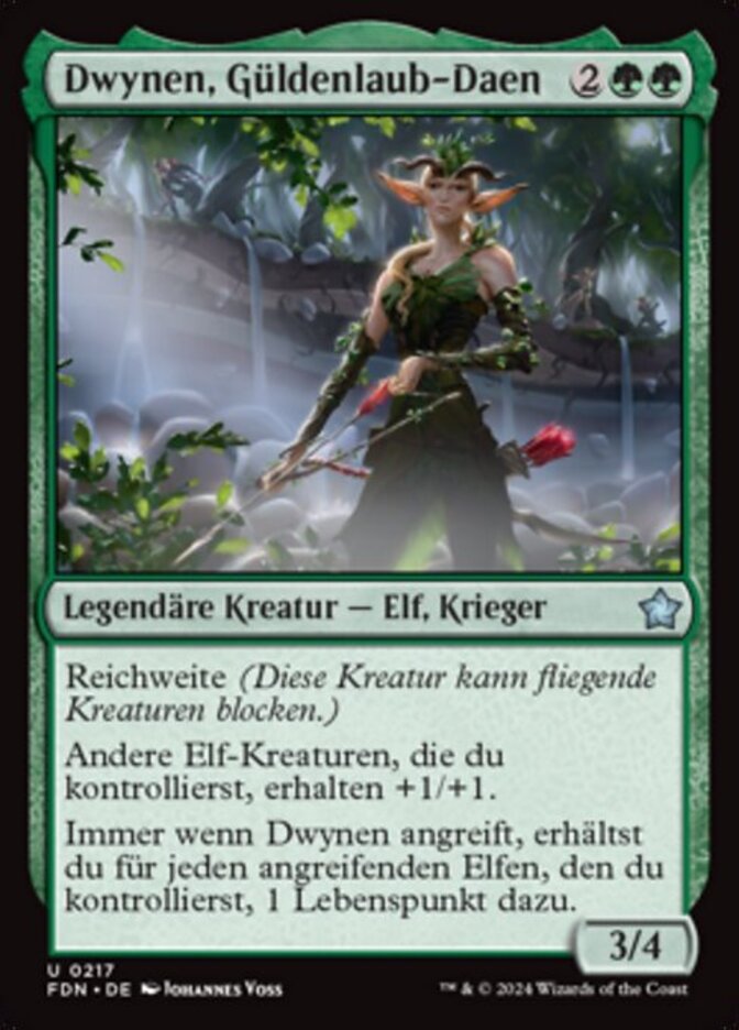 | Rules | Reach Other Elf creatures you control get +1/+1. Whenever Dwynen, Gilt-Leaf Daen attacks, you gain 1 life for each attacking Elf you control. |