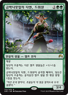 | Rules | Reach Other Elf creatures you control get +1/+1. Whenever Dwynen, Gilt-Leaf Daen attacks, you gain 1 life for each attacking Elf you control. |