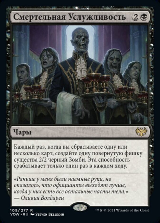 | Rules | Whenever you discard one or more cards, create a tapped 2/2 black Zombie creature token. This ability triggers only once each turn. |