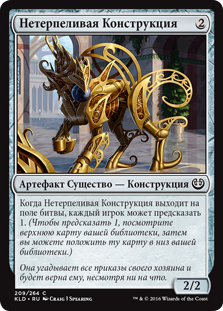Rules When Eager Construct enters the battlefield, each player may scry 1. (To scry 1, look at the top card of your library, then you may put that card on the bottom of your library.)