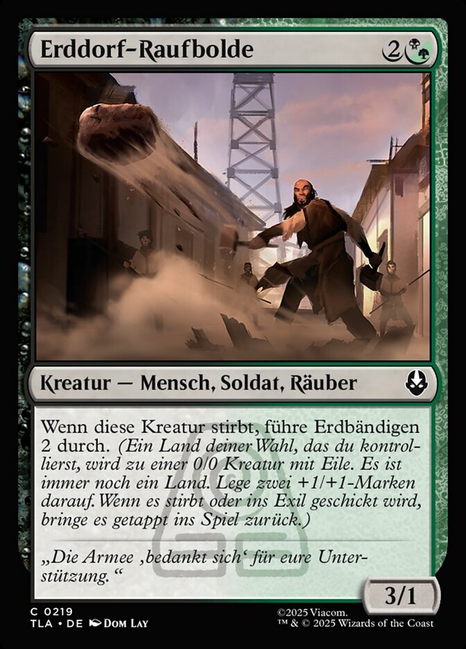 | Rules | When this creature dies, earthbend 2. (Target land you control becomes a 0/0 creature with haste that's still a land. Put two +1/+1 counters on it. When it dies or is exiled, return it to the battlefield tapped.) |