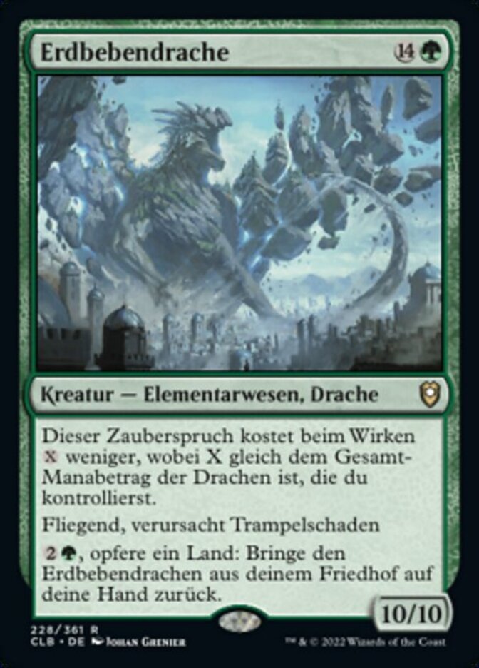 | Rules | This spell costs less to cast, where X is the total mana value of Dragons you control. Flying, trample , Sacrifice a land: Return Earthquake Dragon from your graveyard to your hand. |