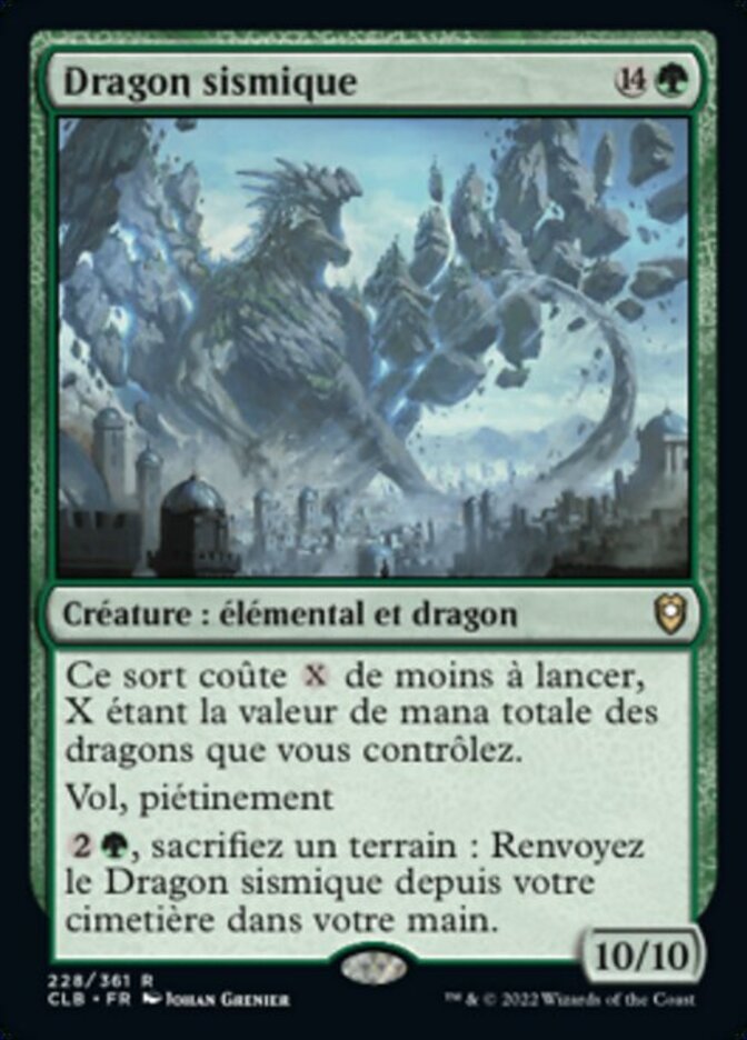 | Rules | This spell costs less to cast, where X is the total mana value of Dragons you control. Flying, trample , Sacrifice a land: Return Earthquake Dragon from your graveyard to your hand. |