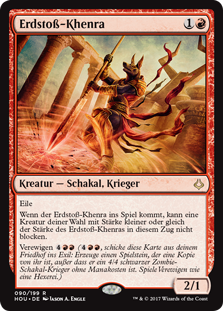 | Rules | Haste When Earthshaker Khenra enters the battlefield, target creature with power less than or equal to Earthshaker Khenra's power can't block this turn. Eternalize (, Exile this card from your graveyard: Create a token that's a copy of it, except it's a 4/4 black Zombie Jackal Warrior with no mana cost. Eternalize only as a sorcery.) |