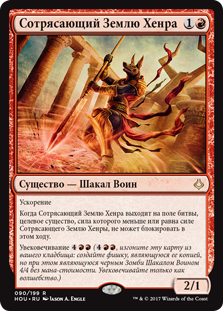 | Rules | Haste When Earthshaker Khenra enters the battlefield, target creature with power less than or equal to Earthshaker Khenra's power can't block this turn. Eternalize (, Exile this card from your graveyard: Create a token that's a copy of it, except it's a 4/4 black Zombie Jackal Warrior with no mana cost. Eternalize only as a sorcery.) |