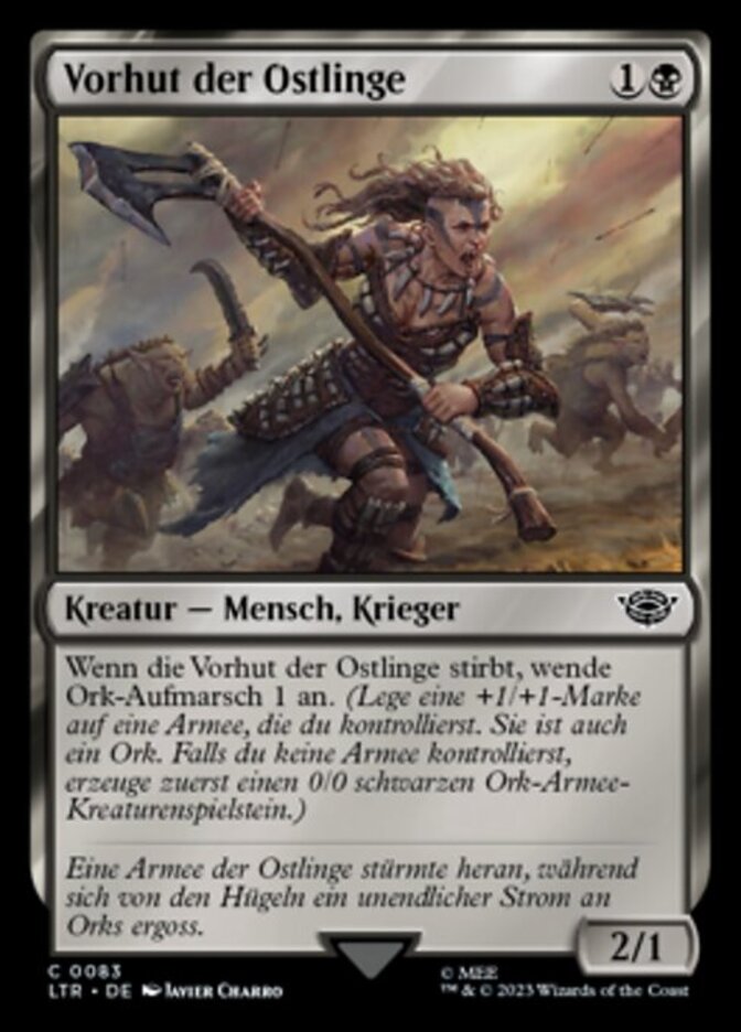 | Rules | When Easterling Vanguard dies, amass Orcs 1. (Put a +1/+1 counter on an Army you control. It's also an Orc. If you don't control an Army, create a 0/0 black Orc Army creature token first.) |