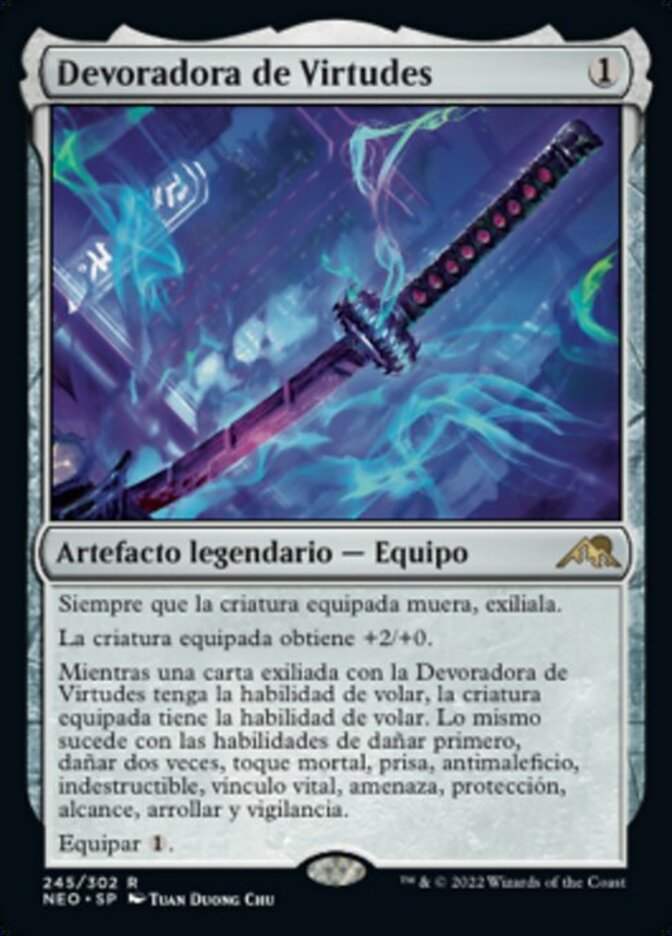 | Rules | Whenever equipped creature dies, exile it. Equipped creature gets +2/+0. As long as a card exiled with Eater of Virtue has flying, equipped creature has flying. The same is true for first strike, double strike, deathtouch, haste, hexproof, indestructible, lifelink, menace, protection, reach, trample, and vigilance. Equip |