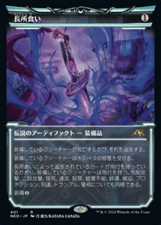 | Rules | Whenever equipped creature dies, exile it. Equipped creature gets +2/+0. As long as a card exiled with Eater of Virtue has flying, equipped creature has flying. The same is true for first strike, double strike, deathtouch, haste, hexproof, indestructible, lifelink, menace, protection, reach, trample, and vigilance. Equip |
