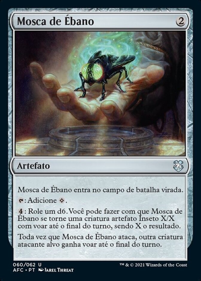 | Rules | Ebony Fly enters the battlefield tapped. : Add . : Roll a d6. Until end of turn, you may have Ebony Fly become an X/X Insect artifact creature with flying, where X is the result. Whenever Ebony Fly attacks, another target attacking creature gains flying until end of turn. |