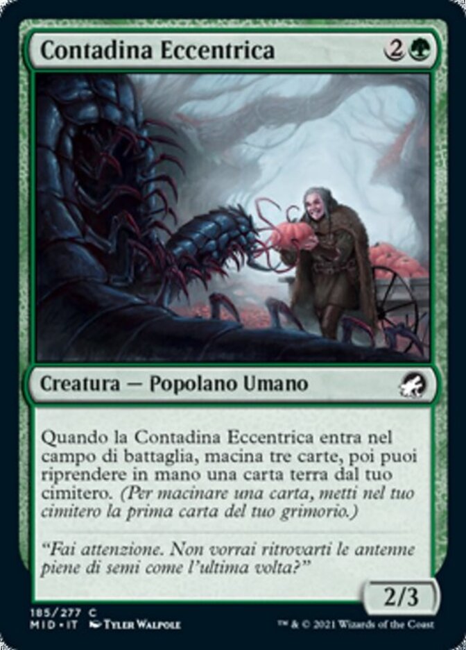 | Rules | When Eccentric Farmer enters the battlefield, mill three cards, then you may return a land card from your graveyard to your hand. (To mill a card, put the top card of your library into your graveyard.) |