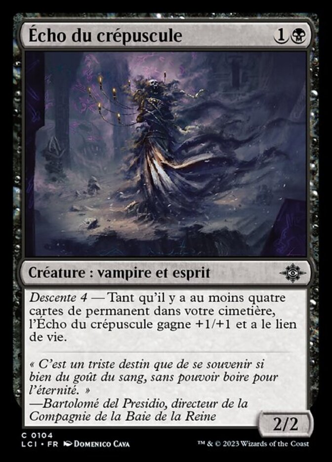 | Rules | Descend 4 — As long as there are four or more permanent cards in your graveyard, Echo of Dusk gets +1/+1 and has lifelink. |