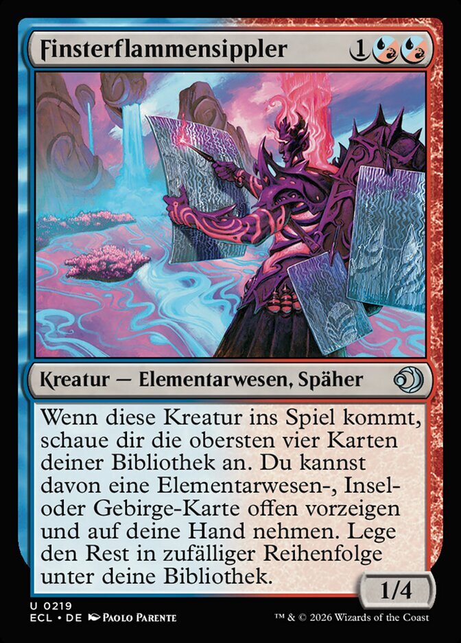 | Rules | When this creature enters, look at the top four cards of your library. You may reveal an Elemental, Island, or Mountain card from among them and put it into your hand. Put the rest on the bottom of your library in a random order. |