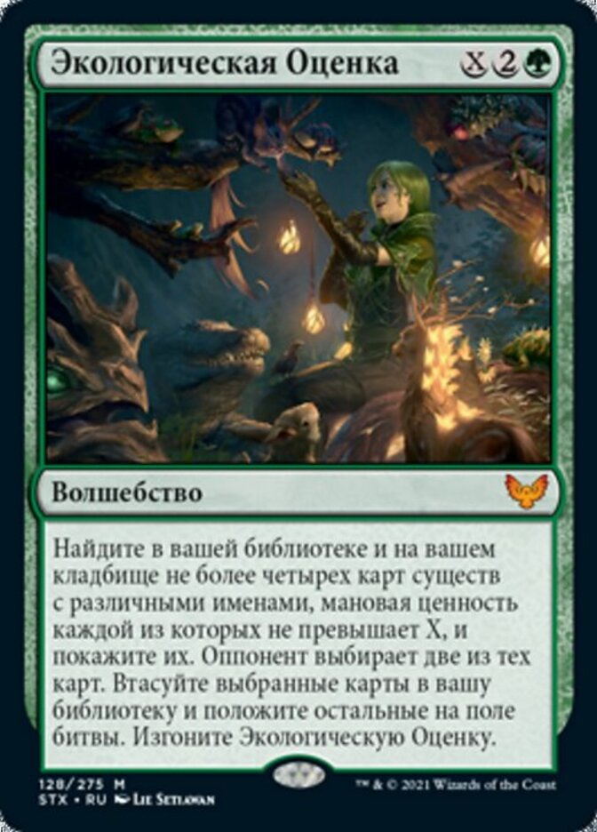 | Rules | Search your library and graveyard for up to four creature cards with different names that each have mana value X or less and reveal them. An opponent chooses two of those cards. Shuffle the chosen cards into your library and put the rest onto the battlefield. Exile Ecological Appreciation. |