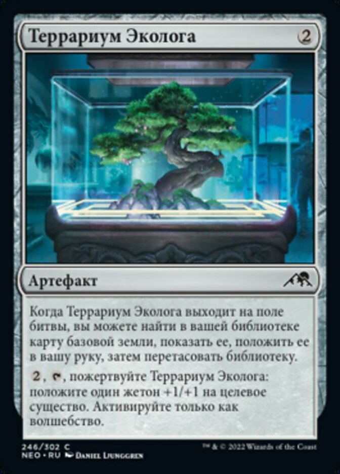 | Rules | When Ecologist's Terrarium enters the battlefield, you may search your library for a basic land card, reveal it, put it into your hand, then shuffle. , , Sacrifice Ecologist's Terrarium: Put a +1/+1 counter on target creature. Activate only as a sorcery. |