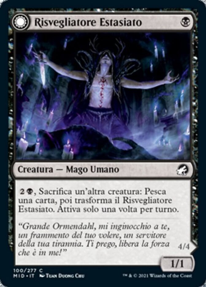 | Rules | , Sacrifice another creature: Draw a card, then transform Ecstatic Awakener. Activate only once each turn. |