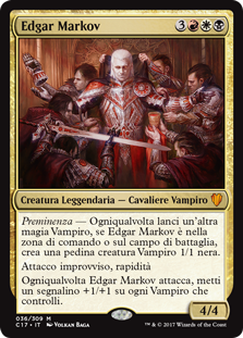 | Rules | Eminence — Whenever you cast another Vampire spell, if Edgar Markov is in the command zone or on the battlefield, create a 1/1 black Vampire creature token. First strike, haste Whenever Edgar Markov attacks, put a +1/+1 counter on each Vampire you control. |