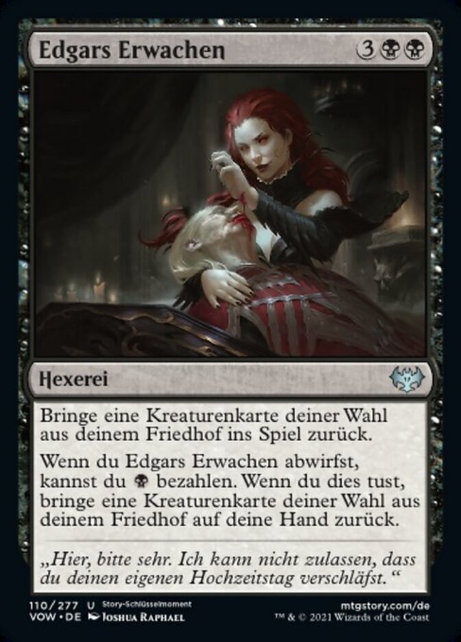 | Rules | Return target creature card from your graveyard to the battlefield. When you discard Edgar's Awakening, you may pay . When you do, return target creature card from your graveyard to your hand. |
