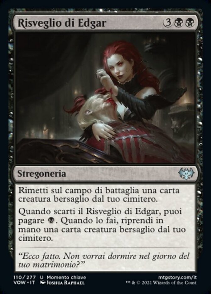 | Rules | Return target creature card from your graveyard to the battlefield. When you discard Edgar's Awakening, you may pay . When you do, return target creature card from your graveyard to your hand. |