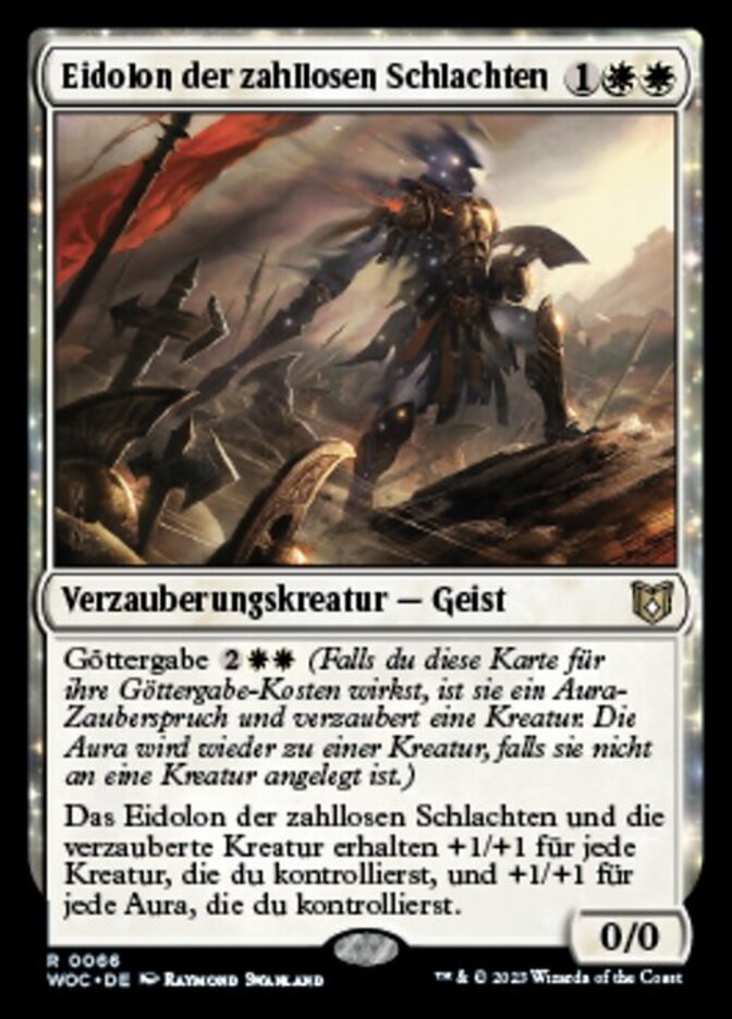 | Rules | Bestow (If you cast this card for its bestow cost, it's an Aura spell with enchant creature. It becomes a creature again if it's not attached to a creature.) Eidolon of Countless Battles and enchanted creature each get +1/+1 for each creature you control and +1/+1 for each Aura you control. |