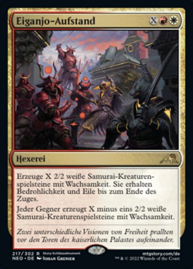 | Rules | Create X 2/2 white Samurai creature tokens with vigilance. They gain menace and haste until end of turn. Each opponent creates X minus one 2/2 white Samurai creature tokens with vigilance. |