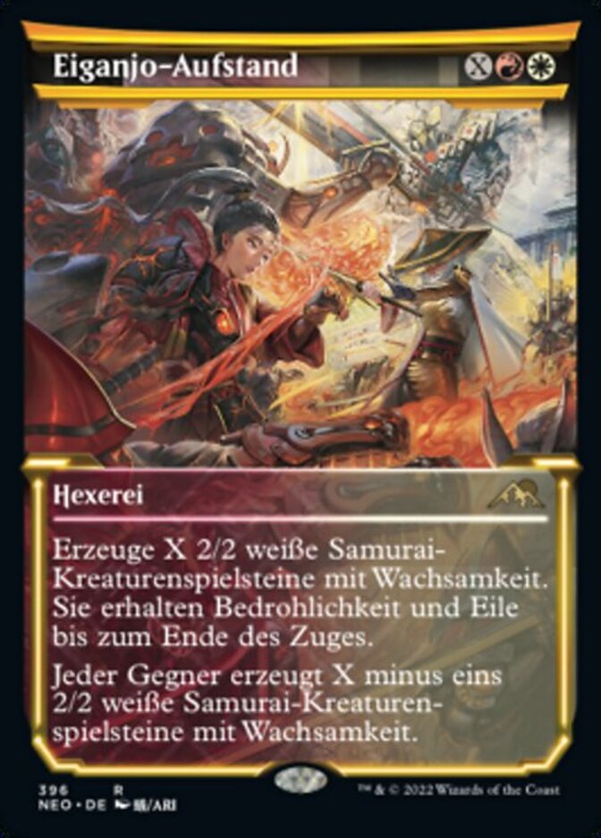 | Rules | Create X 2/2 white Samurai creature tokens with vigilance. They gain menace and haste until end of turn. Each opponent creates X minus one 2/2 white Samurai creature tokens with vigilance. |