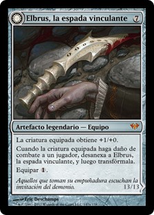 | Rules | Equipped creature gets +1/+0. When equipped creature deals combat damage to a player, unattach Elbrus, the Binding Blade, then transform it. Equip // Flying, intimidate, trample (A creature with intimidate can't be blocked except by artifact creatures and/or creatures that share a color with it.) Whenever a player loses the game, put thirteen +1/+1 counters on Withengar Unbound. |