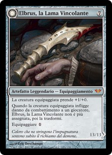 | Rules | Equipped creature gets +1/+0. When equipped creature deals combat damage to a player, unattach Elbrus, the Binding Blade, then transform it. Equip // Flying, intimidate, trample (A creature with intimidate can't be blocked except by artifact creatures and/or creatures that share a color with it.) Whenever a player loses the game, put thirteen +1/+1 counters on Withengar Unbound. |