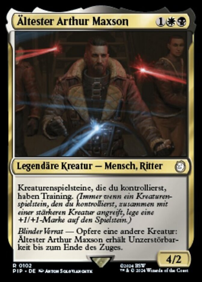 | Rules | Creature tokens you control have training. (Whenever a creature token you control attacks with another creature with greater power, put a +1/+1 counter on that token.) Blind Betrayal — Sacrifice another creature: Elder Arthur Maxson gains indestructible until end of turn. |
