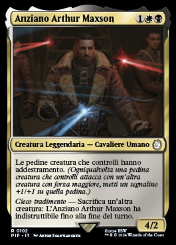 | Rules | Creature tokens you control have training. (Whenever a creature token you control attacks with another creature with greater power, put a +1/+1 counter on that token.) Blind Betrayal — Sacrifice another creature: Elder Arthur Maxson gains indestructible until end of turn. |