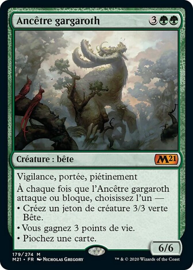| Rules | Vigilance, reach, trample Whenever Elder Gargaroth attacks or blocks, choose one — • Create a 3/3 green Beast creature token. • You gain 3 life. • Draw a card. |