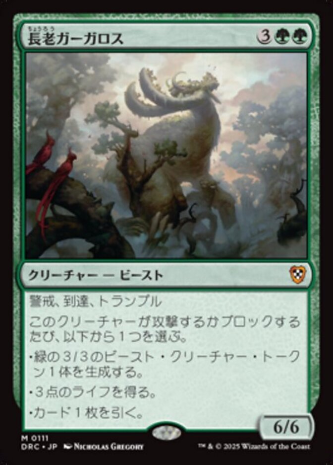 | Rules | Vigilance, reach, trample Whenever Elder Gargaroth attacks or blocks, choose one — • Create a 3/3 green Beast creature token. • You gain 3 life. • Draw a card. |