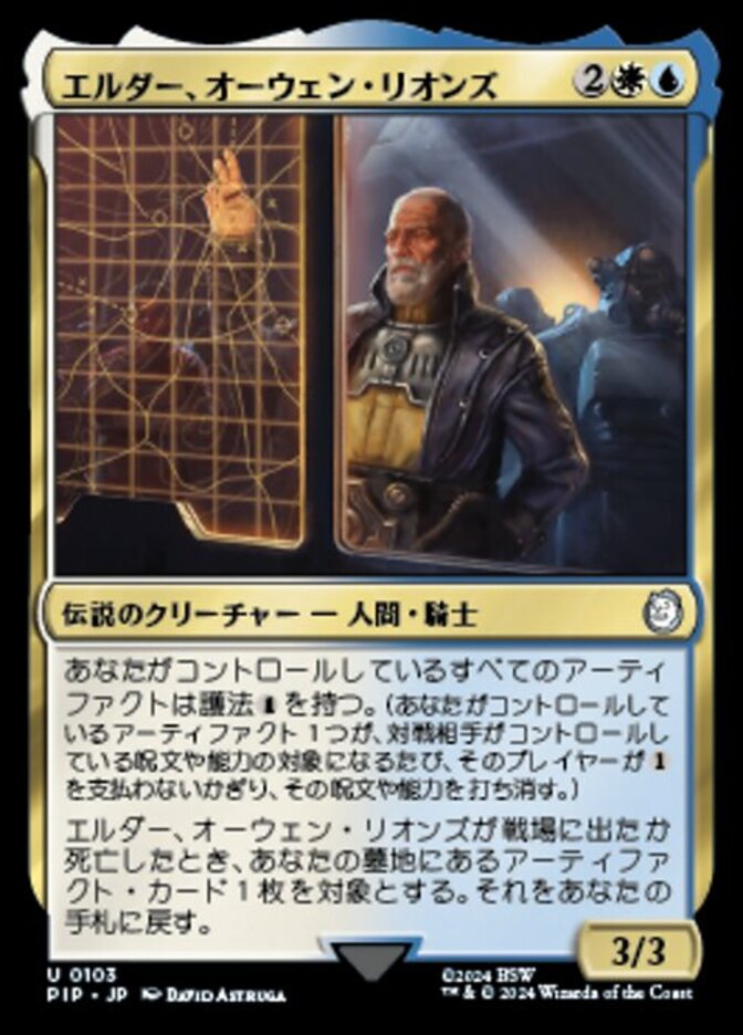 | Rules | Artifacts you control have ward . (Whenever an artifact you control becomes the target of a spell or ability an opponent controls, counter it unless that player pays .) When Elder Owyn Lyons enters the battlefield or dies, return target artifact card from your graveyard to your hand. |