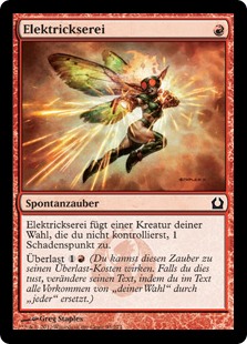 | Rules | Electrickery deals 1 damage to target creature you don't control. Overload (You may cast this spell for its overload cost. If you do, change its text by replacing all instances of "target" with "each.") |