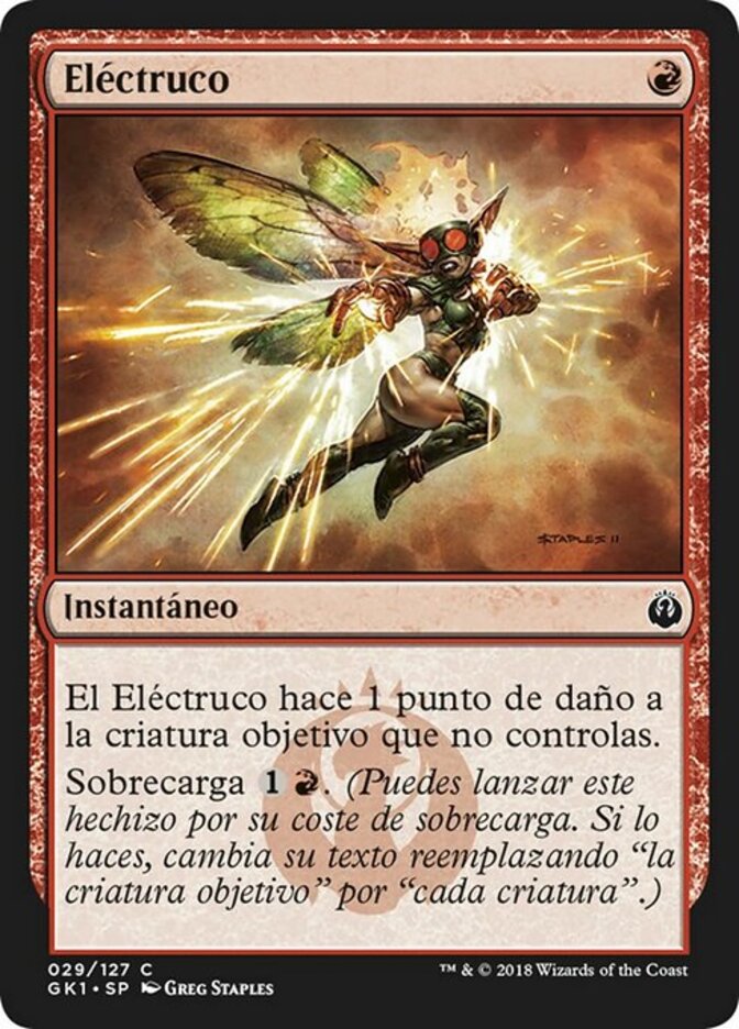 | Rules | Electrickery deals 1 damage to target creature you don't control. Overload (You may cast this spell for its overload cost. If you do, change its text by replacing all instances of "target" with "each.") |