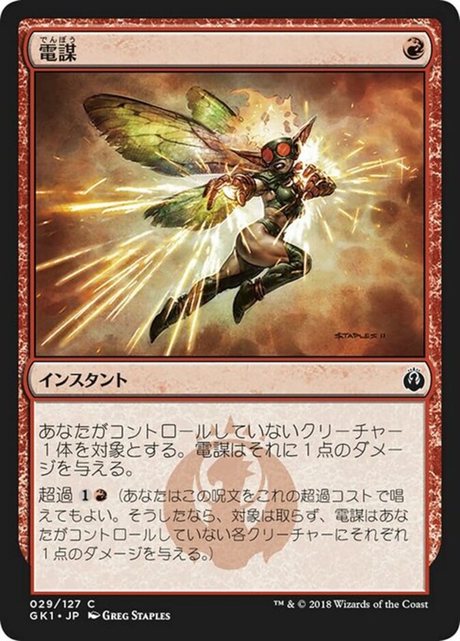 | Rules | Electrickery deals 1 damage to target creature you don't control. Overload (You may cast this spell for its overload cost. If you do, change its text by replacing all instances of "target" with "each.") |