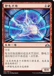 | Rules | Defender Whenever you cast an instant or sorcery spell, Electrostatic Field deals 1 damage to each opponent. |