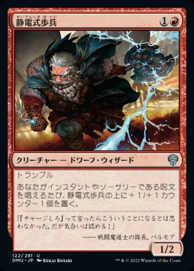 | Rules | Trample Whenever you cast an instant or sorcery spell, put a +1/+1 counter on Electrostatic Infantry. |