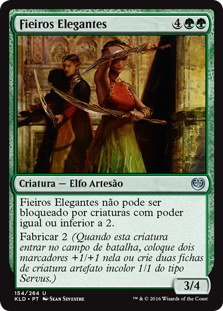 | Rules | Elegant Edgecrafters can't be blocked by creatures with power 2 or less. Fabricate 2 (When this creature enters the battlefield, put two +1/+1 counters on it or create two 1/1 colorless Servo artifact creature tokens.) |