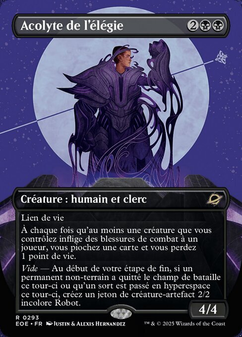 | Rules | Lifelink Whenever one or more creatures you control deal combat damage to a player, you draw a card and lose 1 life. Void — At the beginning of your end step, if a nonland permanent left the battlefield this turn or a spell was warped this turn, create a 2/2 colorless Robot artifact creature token. |