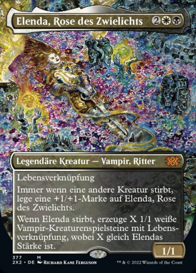 | Rules | Lifelink Whenever another creature dies, put a +1/+1 counter on Elenda, the Dusk Rose. When Elenda dies, create X 1/1 white Vampire creature tokens with lifelink, where X is Elenda's power. |