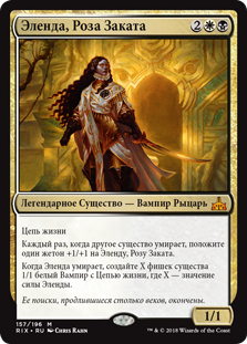 | Rules | Lifelink Whenever another creature dies, put a +1/+1 counter on Elenda, the Dusk Rose. When Elenda dies, create X 1/1 white Vampire creature tokens with lifelink, where X is Elenda's power. |