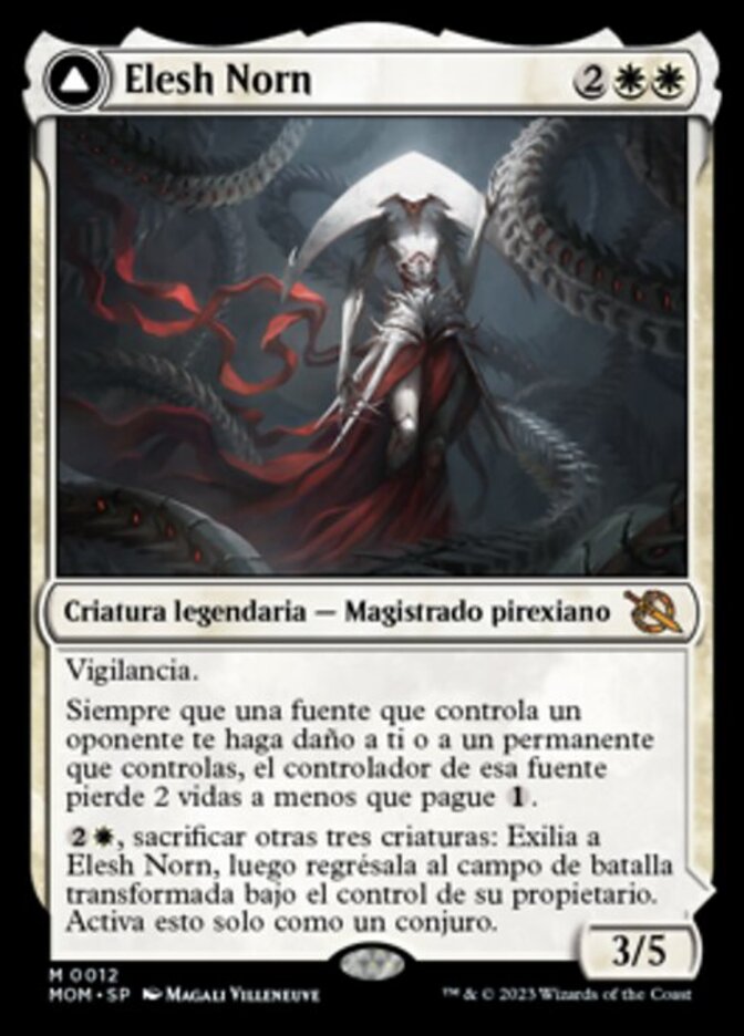 | Rules | Vigilance Whenever a source an opponent controls deals damage to you or a permanent you control, that source's controller loses 2 life unless they pay . , Sacrifice three other creatures: Exile Elesh Norn, then return it to the battlefield transformed under its owner's control. Activate only as a sorcery. // (As this Saga enters and after your draw step, add a lore counter.) I — Incubate 2 five times, then transform all Incubator tokens you control. II — Creatures you control get +1/+1 and gain double strike until end of turn. III — Destroy all other permanents except for artifacts, lands, and Phyrexians. Exile The Argent Etchings, then return it to the battlefield (front face up). |