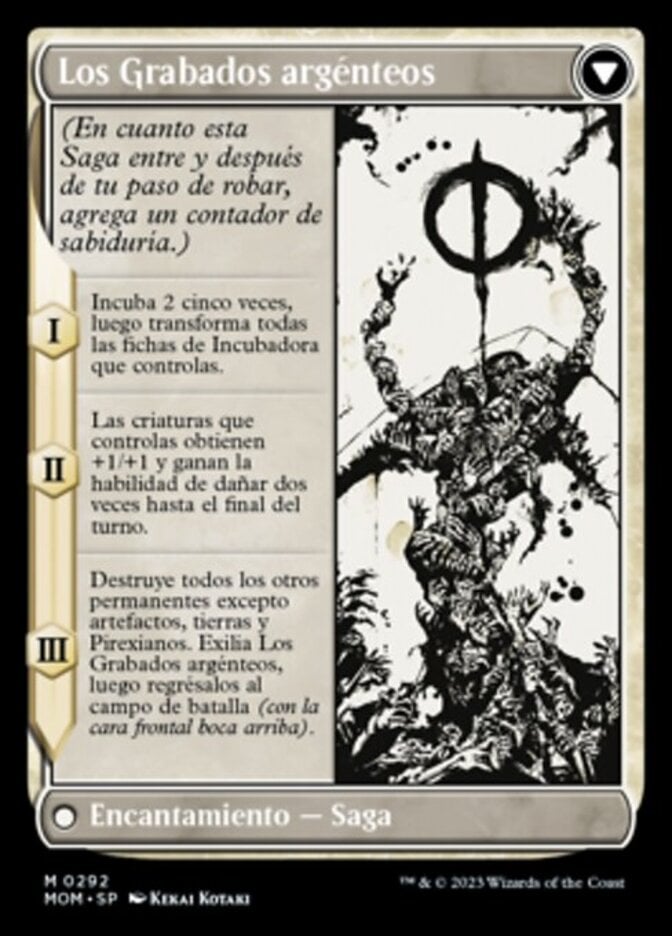 | Rules | Vigilance Whenever a source an opponent controls deals damage to you or a permanent you control, that source's controller loses 2 life unless they pay . , Sacrifice three other creatures: Exile Elesh Norn, then return it to the battlefield transformed under its owner's control. Activate only as a sorcery. // (As this Saga enters and after your draw step, add a lore counter.) I — Incubate 2 five times, then transform all Incubator tokens you control. II — Creatures you control get +1/+1 and gain double strike until end of turn. III — Destroy all other permanents except for artifacts, lands, and Phyrexians. Exile The Argent Etchings, then return it to the battlefield (front face up). |
