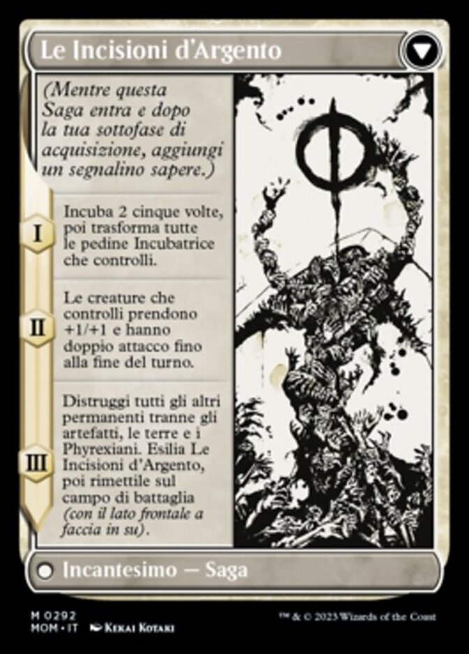 | Rules | Vigilance Whenever a source an opponent controls deals damage to you or a permanent you control, that source's controller loses 2 life unless they pay . , Sacrifice three other creatures: Exile Elesh Norn, then return it to the battlefield transformed under its owner's control. Activate only as a sorcery. // (As this Saga enters and after your draw step, add a lore counter.) I — Incubate 2 five times, then transform all Incubator tokens you control. II — Creatures you control get +1/+1 and gain double strike until end of turn. III — Destroy all other permanents except for artifacts, lands, and Phyrexians. Exile The Argent Etchings, then return it to the battlefield (front face up). |