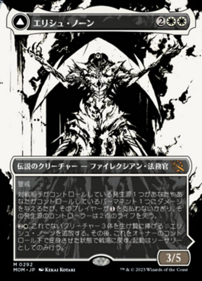 | Rules | Vigilance Whenever a source an opponent controls deals damage to you or a permanent you control, that source's controller loses 2 life unless they pay . , Sacrifice three other creatures: Exile Elesh Norn, then return it to the battlefield transformed under its owner's control. Activate only as a sorcery. // (As this Saga enters and after your draw step, add a lore counter.) I — Incubate 2 five times, then transform all Incubator tokens you control. II — Creatures you control get +1/+1 and gain double strike until end of turn. III — Destroy all other permanents except for artifacts, lands, and Phyrexians. Exile The Argent Etchings, then return it to the battlefield (front face up). |