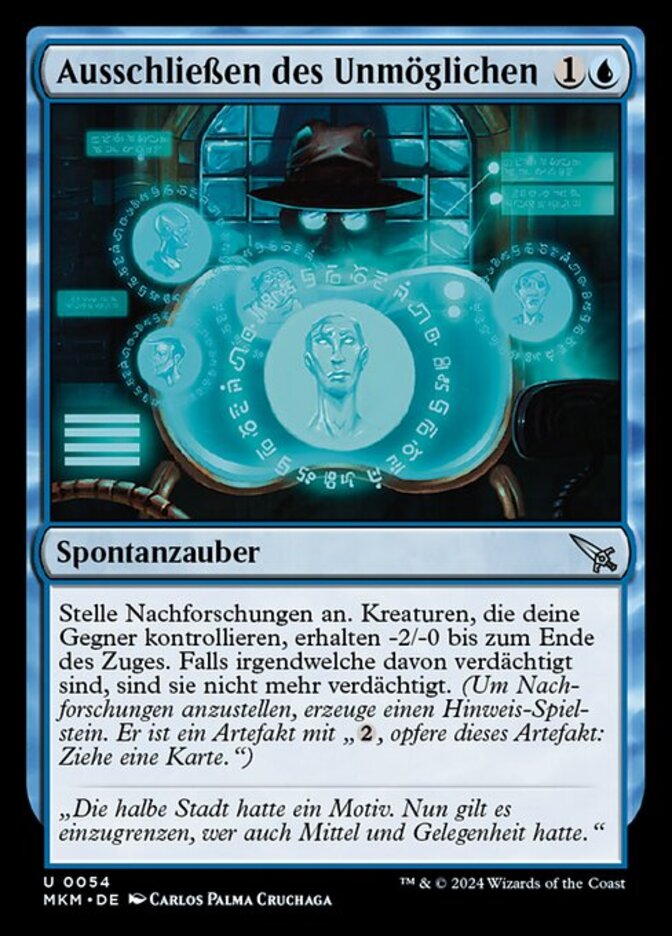 | Rules | Investigate. Creatures your opponents control get -2/-0 until end of turn. If any of them are suspected, they're no longer suspected. (To investigate, create a Clue token. It's an artifact with ", Sacrifice this artifact: Draw a card.") |