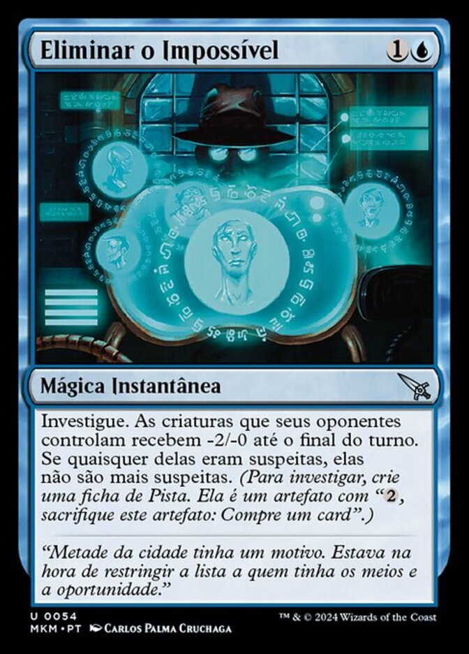 | Rules | Investigate. Creatures your opponents control get -2/-0 until end of turn. If any of them are suspected, they're no longer suspected. (To investigate, create a Clue token. It's an artifact with ", Sacrifice this artifact: Draw a card.") |