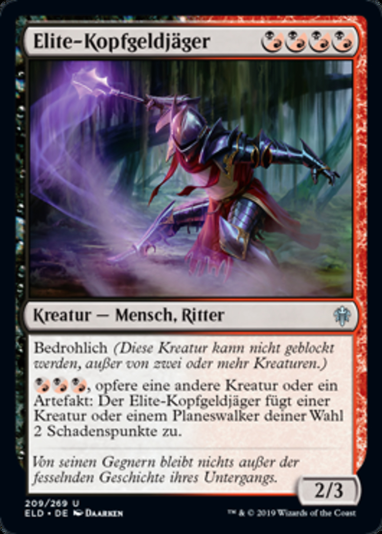 | Rules | Menace (This creature can't be blocked except by two or more creatures.) , Sacrifice another creature or an artifact: Elite Headhunter deals 2 damage to target creature or planeswalker. |