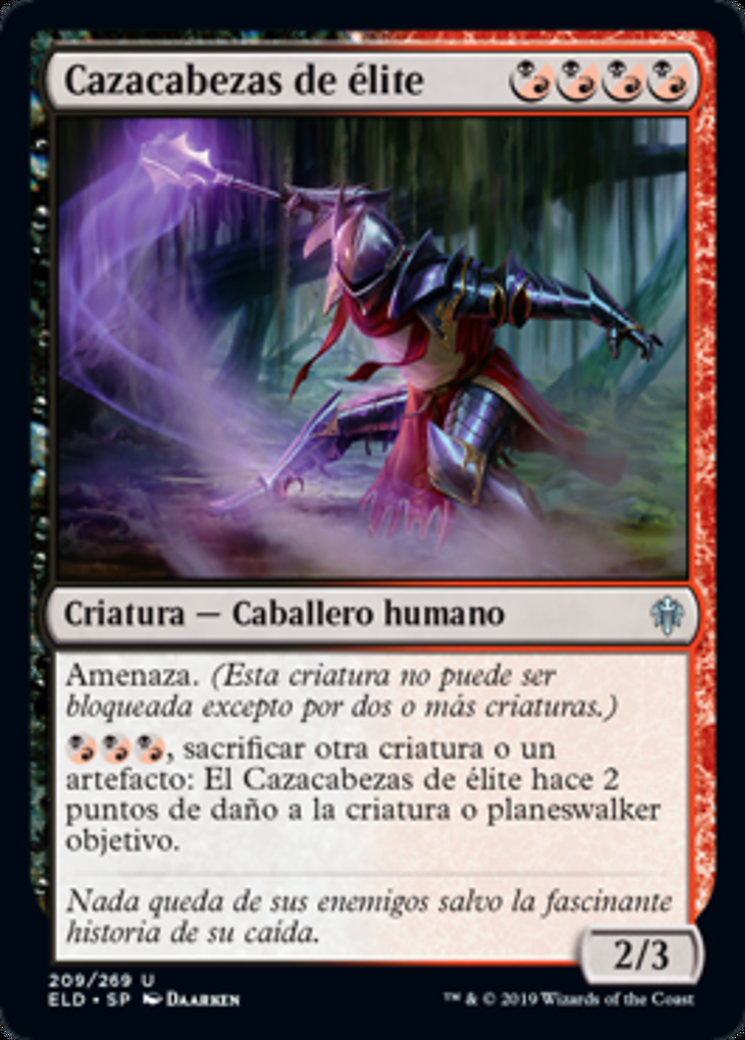| Rules | Menace (This creature can't be blocked except by two or more creatures.) , Sacrifice another creature or an artifact: Elite Headhunter deals 2 damage to target creature or planeswalker. |