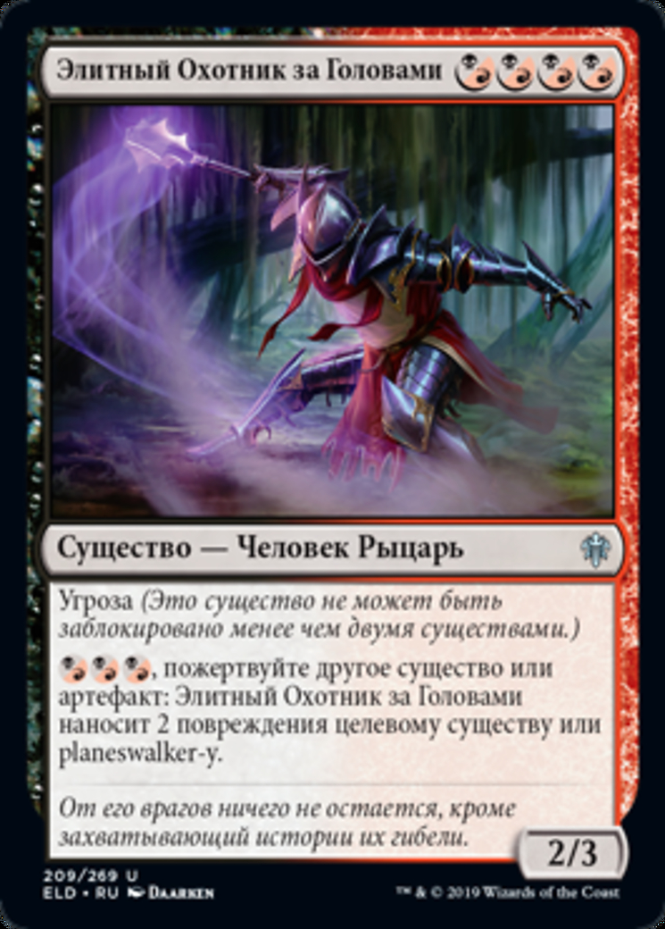 | Rules | Menace (This creature can't be blocked except by two or more creatures.) , Sacrifice another creature or an artifact: Elite Headhunter deals 2 damage to target creature or planeswalker. |